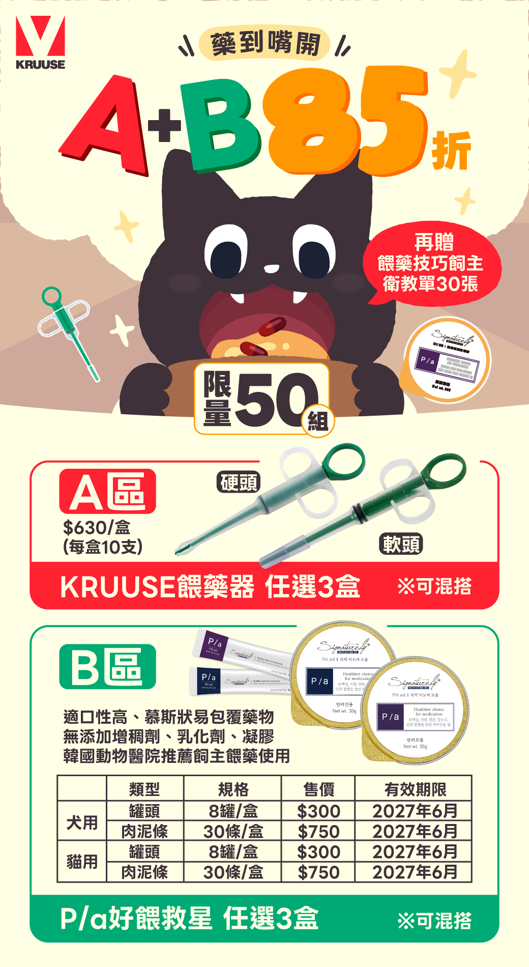A區*3盒+B區*3盒= 1組,每組享85折,並贈餵藥技巧飼主衛教單30張